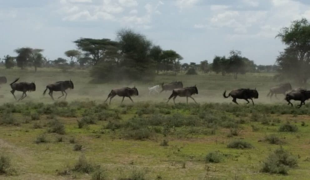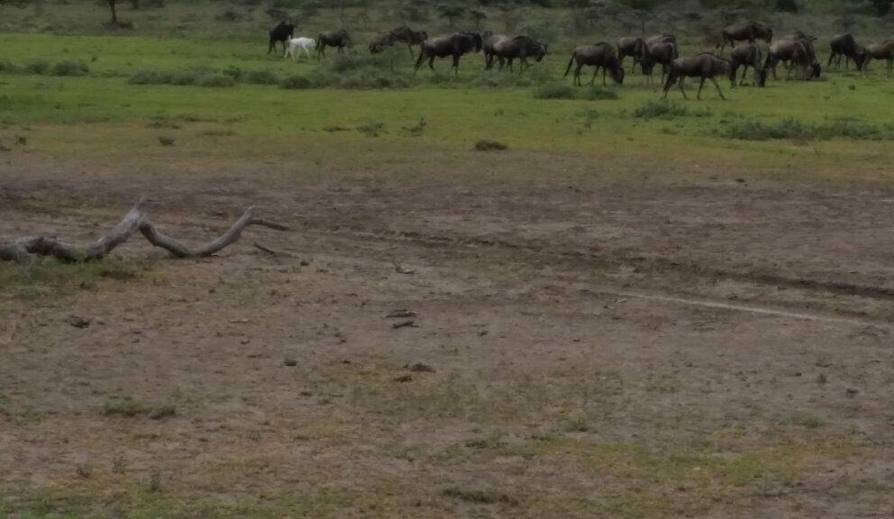 Another wonderfully unusual sighting sent in today from Nomad guide Cornelius Mukus who spotted this incredible, seemingly albino, white wildebeest calf while with his guests in Ndutu. Peter Carrick kindly sent these images…a little indistinct because they were on the run but spectacular nonetheless!