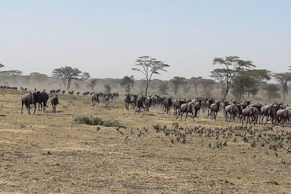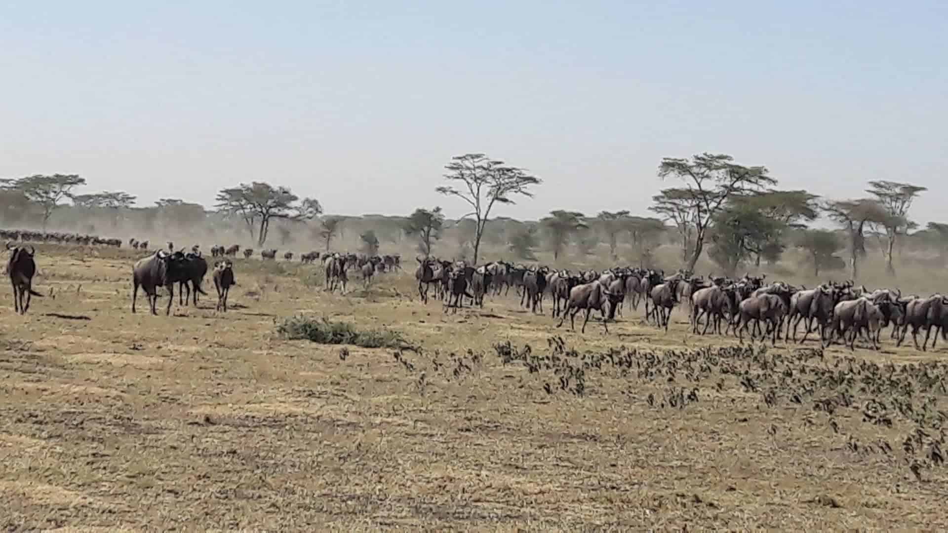 The wildebeest herds begins moving faster in search of water and greener grass, making their way across the southwest Serengeti (Maswa Game Reserve and Serengeti moru Kopjes).