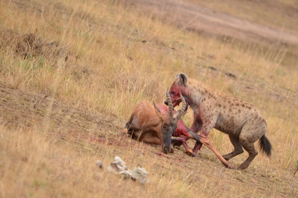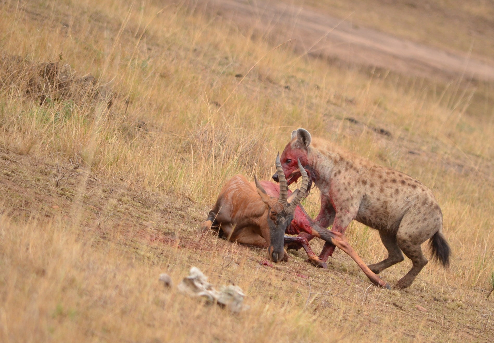 Yesterday morning, only 1 km away from Rekero Camp, a hyena pulled down a topi. A few minutes later, Malaika and her three cubs pushed him away from his delicacy, which is quite rare and uncommon since its always hyenas which are documented stealing cheetah food!