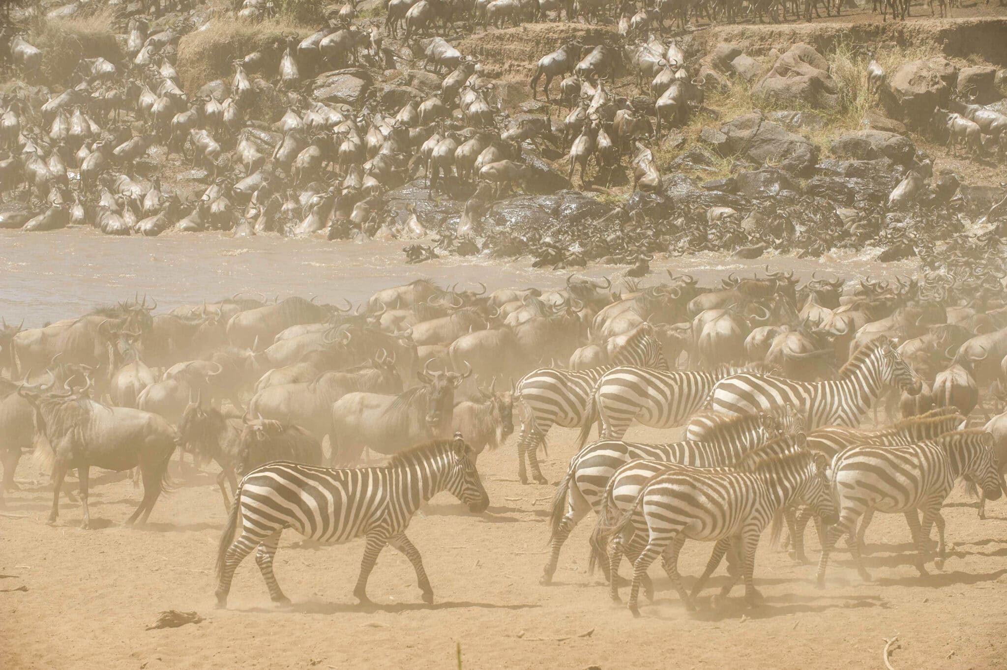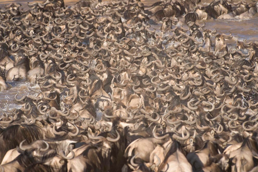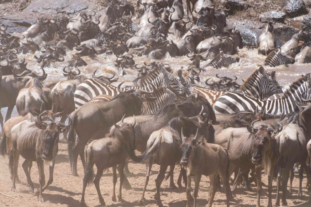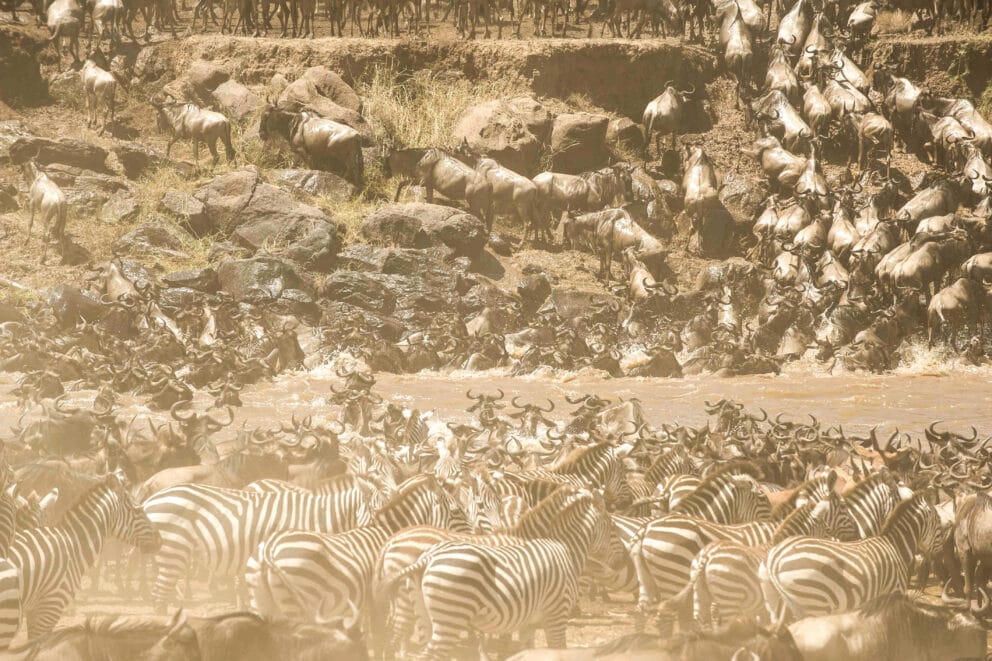Guides are saying that the last crossing at 10:30 a.m. was the largest seen at any one time in many years. A few were taken by crocodile and many succumbed to being trodden and died whilst try to cross and clamber up the rocks on the west bank of the Mara River.