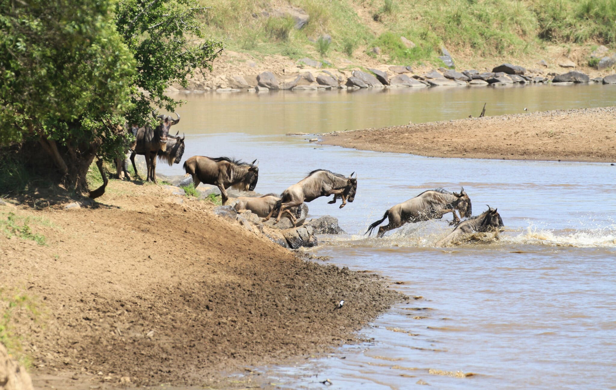 Later at 10:00 a.m, more wildebeest crossed from west to east at the cul de sac crossing up stream from the main crossing. They crossed at two places, with an estimate of 2,000 crossing.