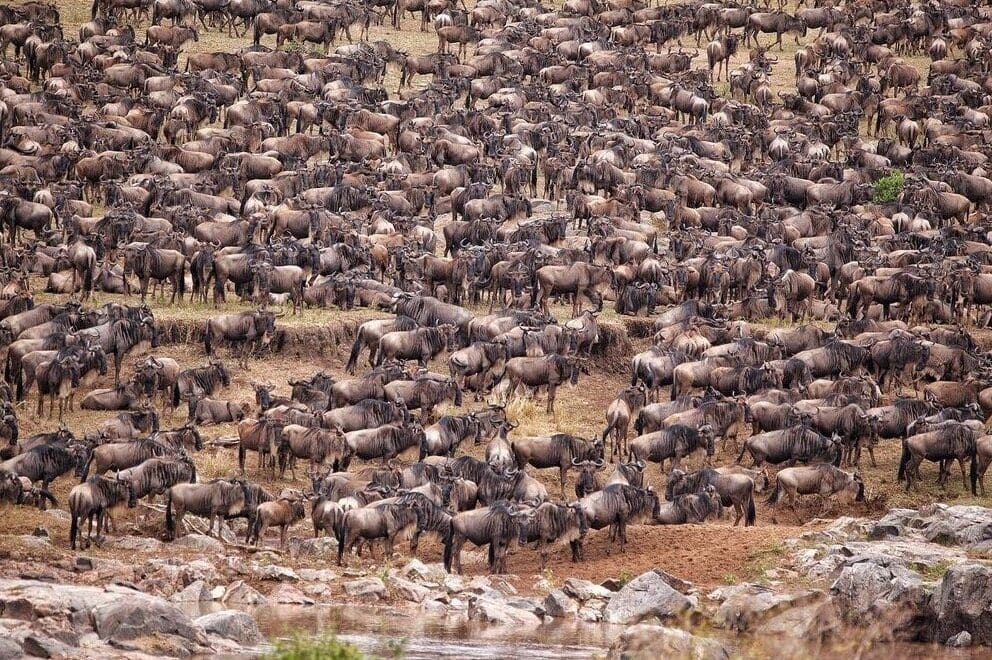 This herd was spotted at crossing no 10. This massive wildebeest herd is showing why they are often referred to as the ‘black carpet’ over the plains! Crossing no 10 is the closest crossing point to the Kenyan and Tanzanian border, and is also near where the Sand river begins.