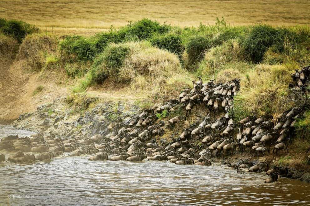 As we speak, a major crossing on the side of the Mara River below Lookout Hill at Miti Moja is happening. Approximately 800-900 Wildebeest have taken a leap of faith and crossed over into the mara triangle. Water levels are low this year which could be the reason that there were no casualties with this crossing.