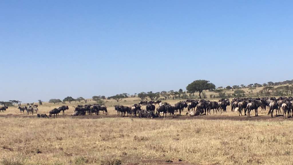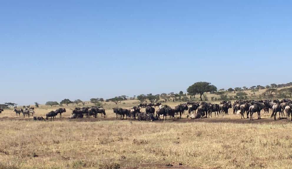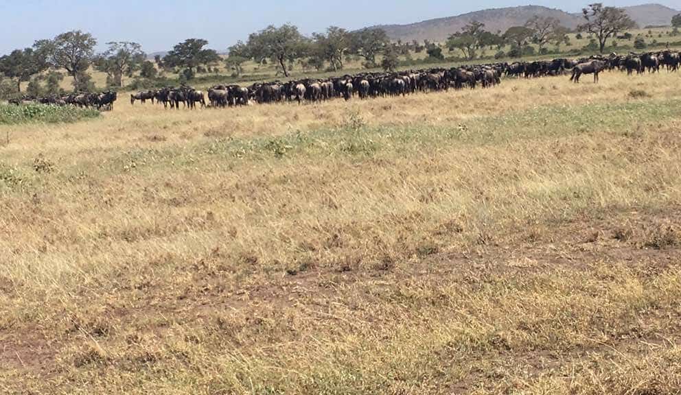 Safari guide Baraka Willium, watched a stampede by a large herd of wildebeest and zebra coming from the direction of the Ndutu area towards the Moru Kopjes.