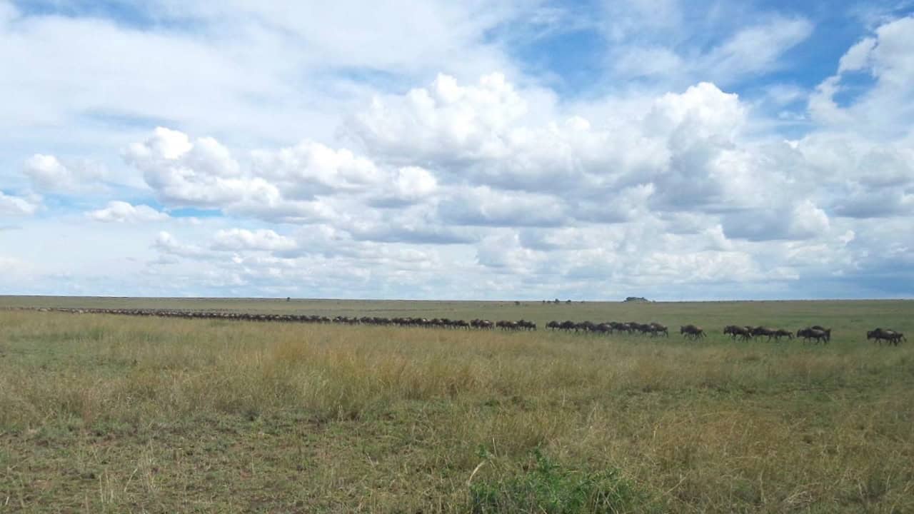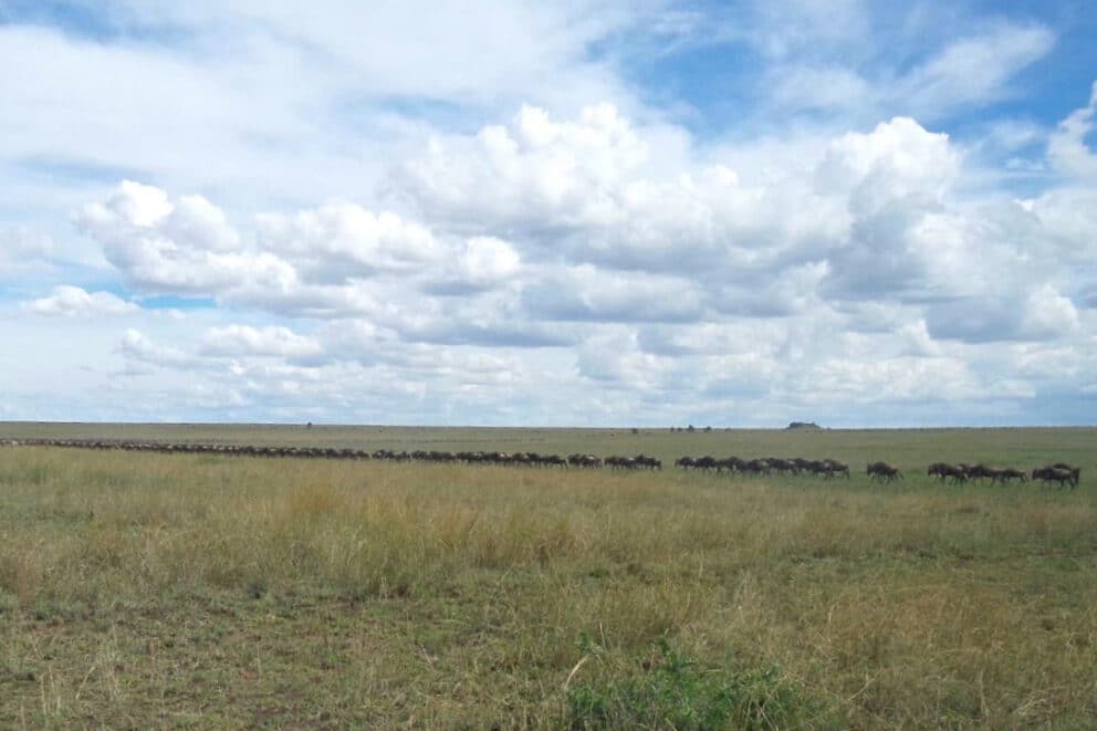 One of our guides – Priscus Sulle – took this photo yesterday as a long line heading south ,around the Maasai Kopje's area, and he said that there are wildebeest as far south as Simba Kopjes.