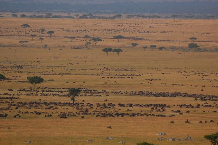 ENQUIRE TODAYHead guide, Mark Nicholson witnessed the migration spread out across the Sasakwa Plain during his morning game drives.