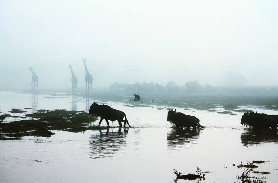 Misty morning crossings in the Ndutu Safari Lodge. Ndutu’s 34 Cottages all face Lake Ndutu and have en-suite bathrooms and verandahs from which to enjoy the view.