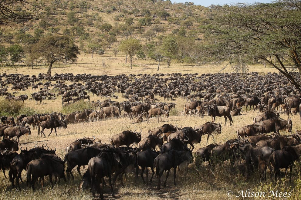 A huge herd of wildebeest – at least 10,000 strong is currently 15 minutes drive away from Serengeti Pioneer Camp.