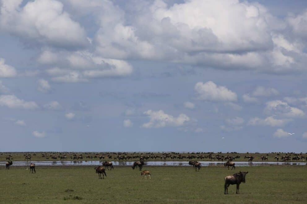 Scores of wildebeest are still pouring through Ndutu, where calves are being born in great numbers. While the rains are continuing, the Ngorongoro Plains offer life-giving water before the wildbeest eventually move on.