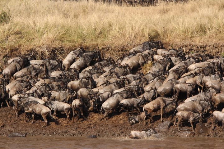 Herds from the wildebeest migration continue to cross the Mara River. Yesterday morning they gathered at an area called deadly crossing point. Then suddenly a lioness appeared cutting the herds in two. In panic one group as forced to cross the Mara river whilst the other group ran back towards the plains. It was a very quick crossing each fighting not to be at the back.