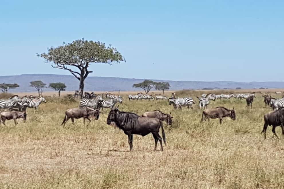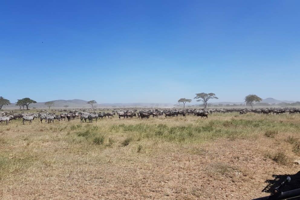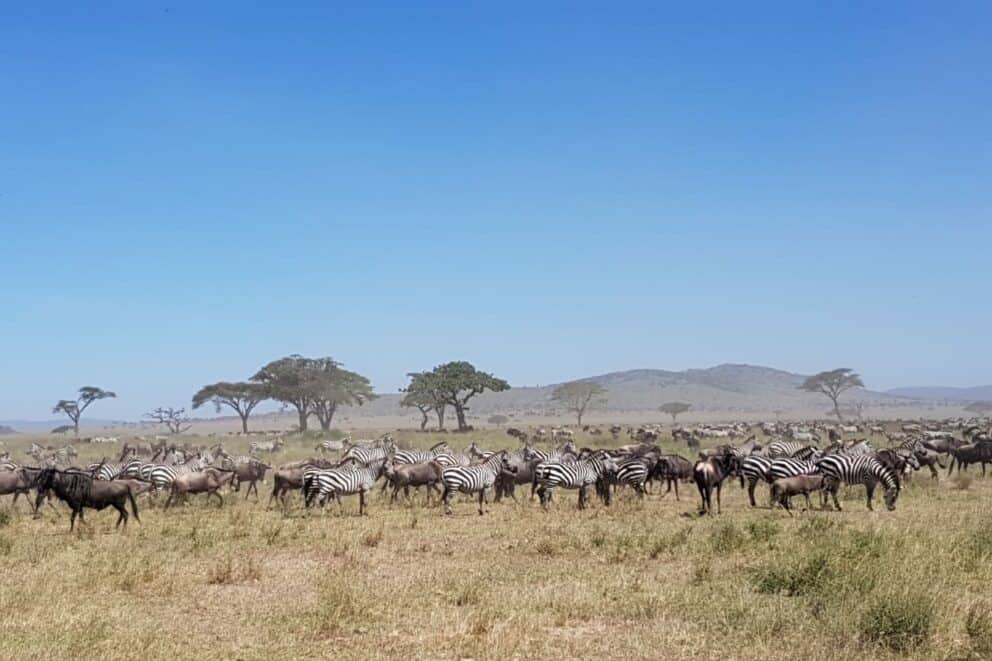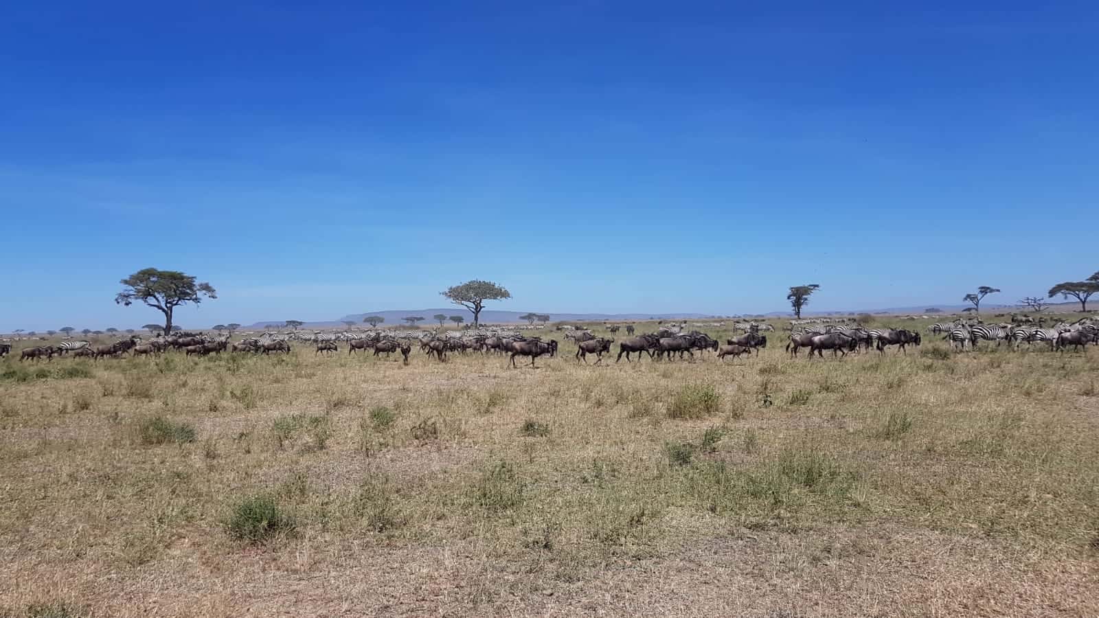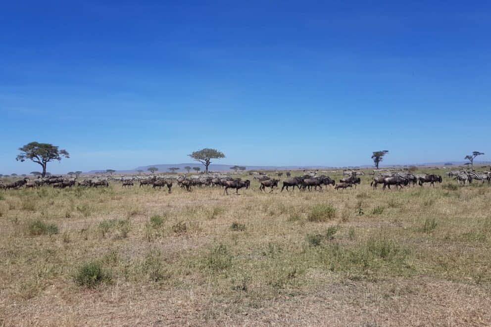 The wildebeest migration was captured accompanied by a large number of zebra in the central Seronera.