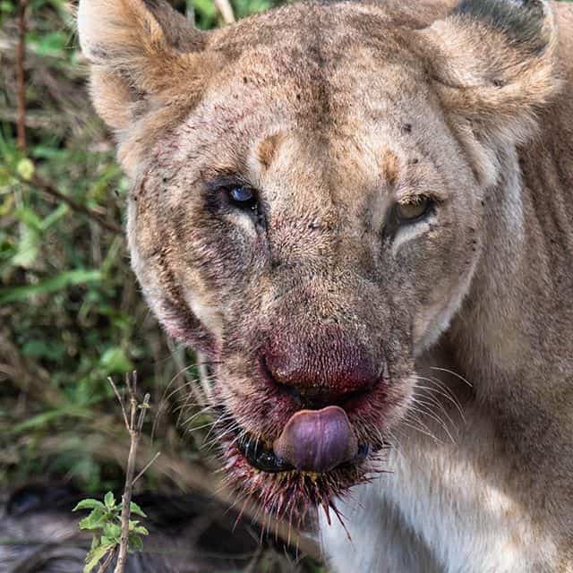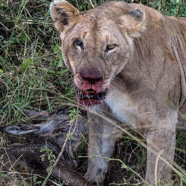 There are crocodiles in the river and other predators waiting elsewhere. Unbeknownst to Maralee Park, there was a lioness hiding in the tall grass waiting for the right moment to attack. It happened so fast that Maralee Park didn’t see it right away, but in the action happened in front of them – a lioness attacked one of the wildebeest. After a few minutes, Maralee Park’s ranger moved the vehicle a little closer. The lioness actually killed at least 2, maybe 3 wildebeest while they were there.