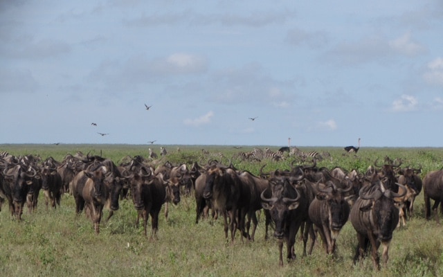 We had a quiet morning drive towards Big Marsh, but suddenly I heard the stampede and I thought it was wind. From Miti Mitatu, when I looked through my binoculars, I couldn’t quite believe my eyes – a large herd of wildebeest and zebras coming from the direction of Olbaye toward the open woodland that goes to the Marsh.