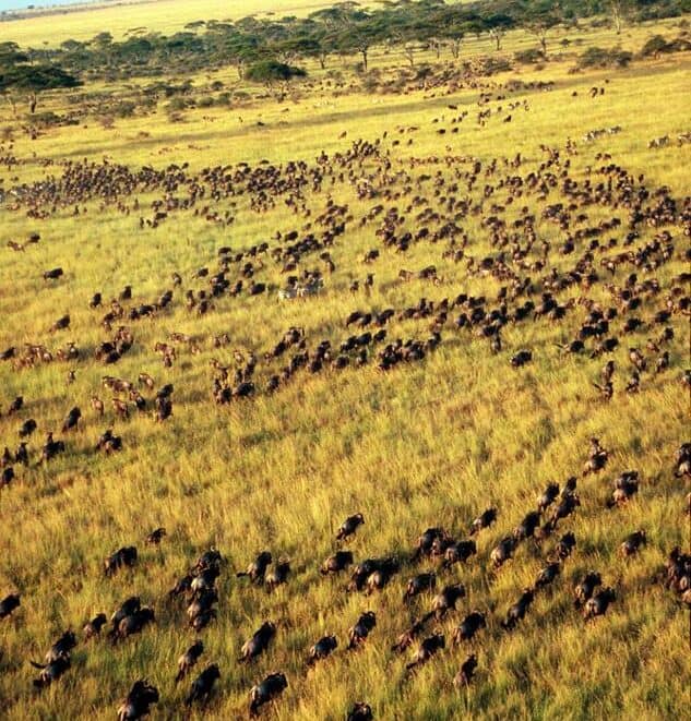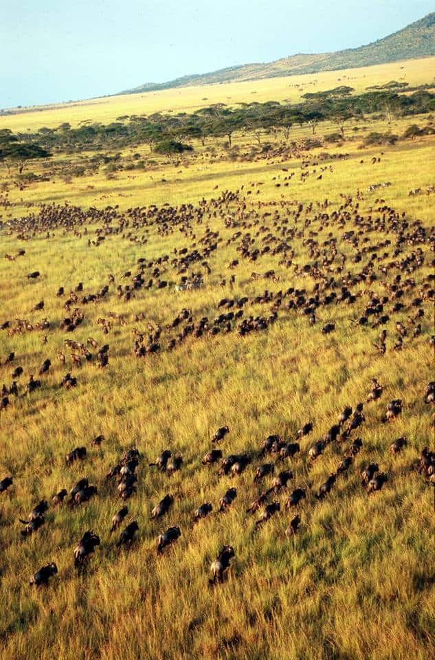 The herds are scattered on the short plains of the southern Serengeti from the Naabi Hill to the Hidden Valley throughout the Ngorongoro Conservation Area.