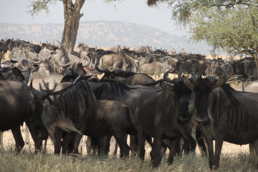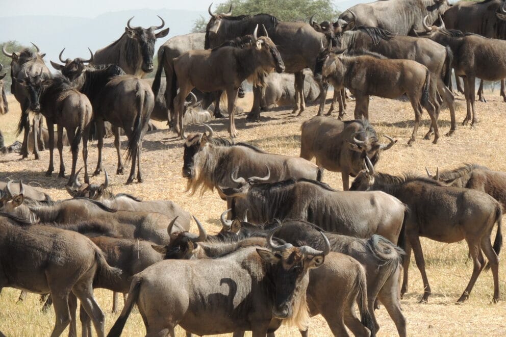 Currently we are around the Serengeti western corridor, although the area looks dry but a herd of wildebeest migration are all scattered all over!