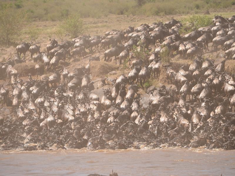 Safari guide John Letara captured a huge number of herds crossing the Mara River in the Serengeti. Due to the low water levels, the wildebeest crossed safely.