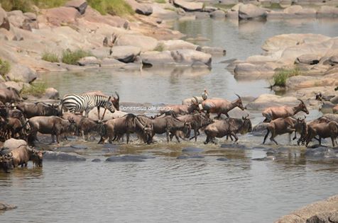 Wildebeest, topi and zebra crossed the Talek River yesterday, 100 metres from the dining area at Rekero Asilia Camp.