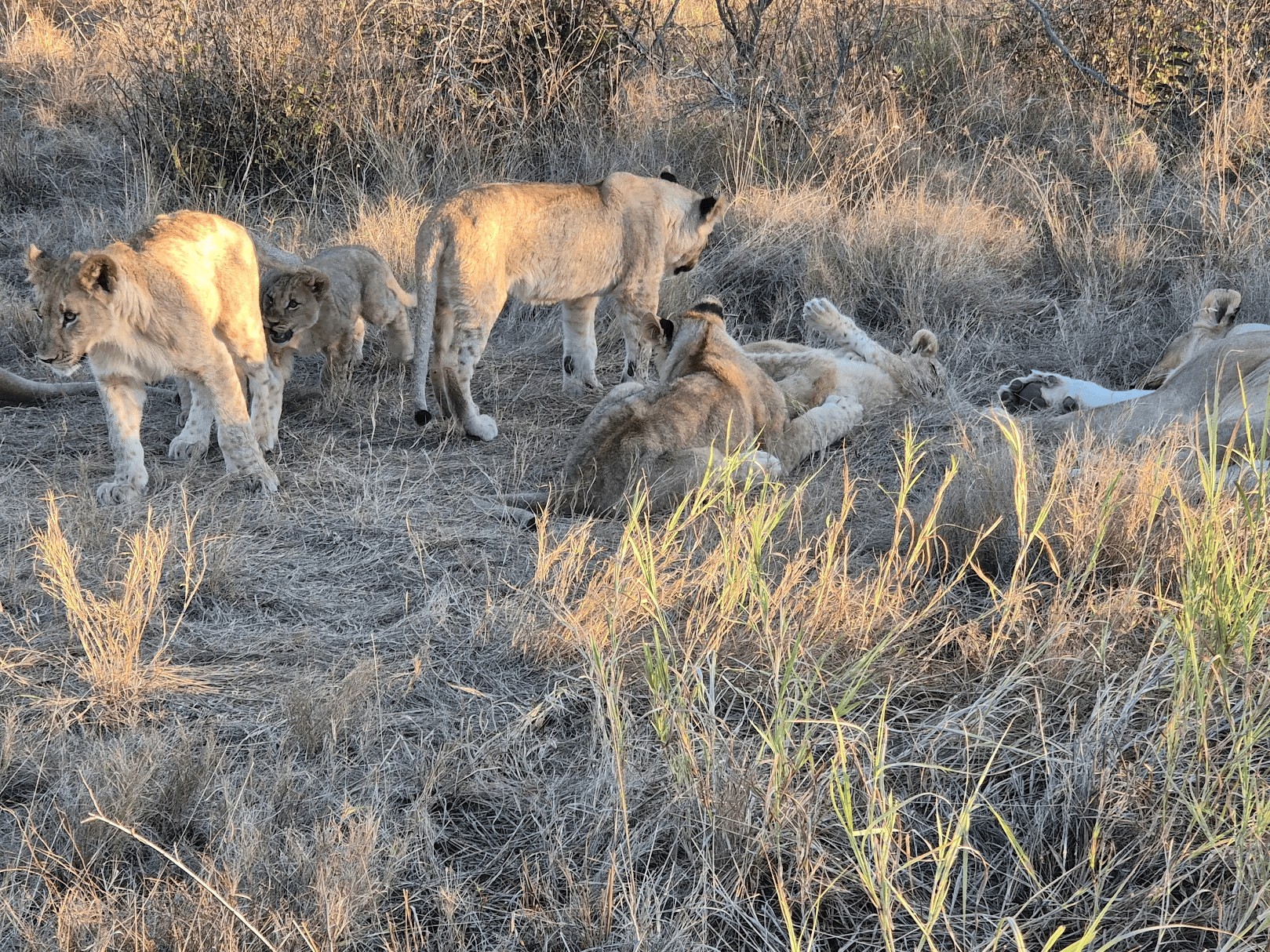And finally, the exciting game drives and the wildlife. We were privileged to see the Magnificent Seven (Big Five plus wild dog and cheetah) plus both varieties of hyena and owls, eagles, honey badgers, jackals, baboons, monkeys, warthogs, tree and ground squirrels, mongooses, and zebras, giraffes, and various antelopes and others I’ve missed! There were many highlights but two in particular were a leopard in a tree crunching on his impala kills when three lions decided to try to relieve him of it and a pack of wild dogs who spent an entire day around the Jamala waterhole feasting on a kudu who had been chased in there overnight.