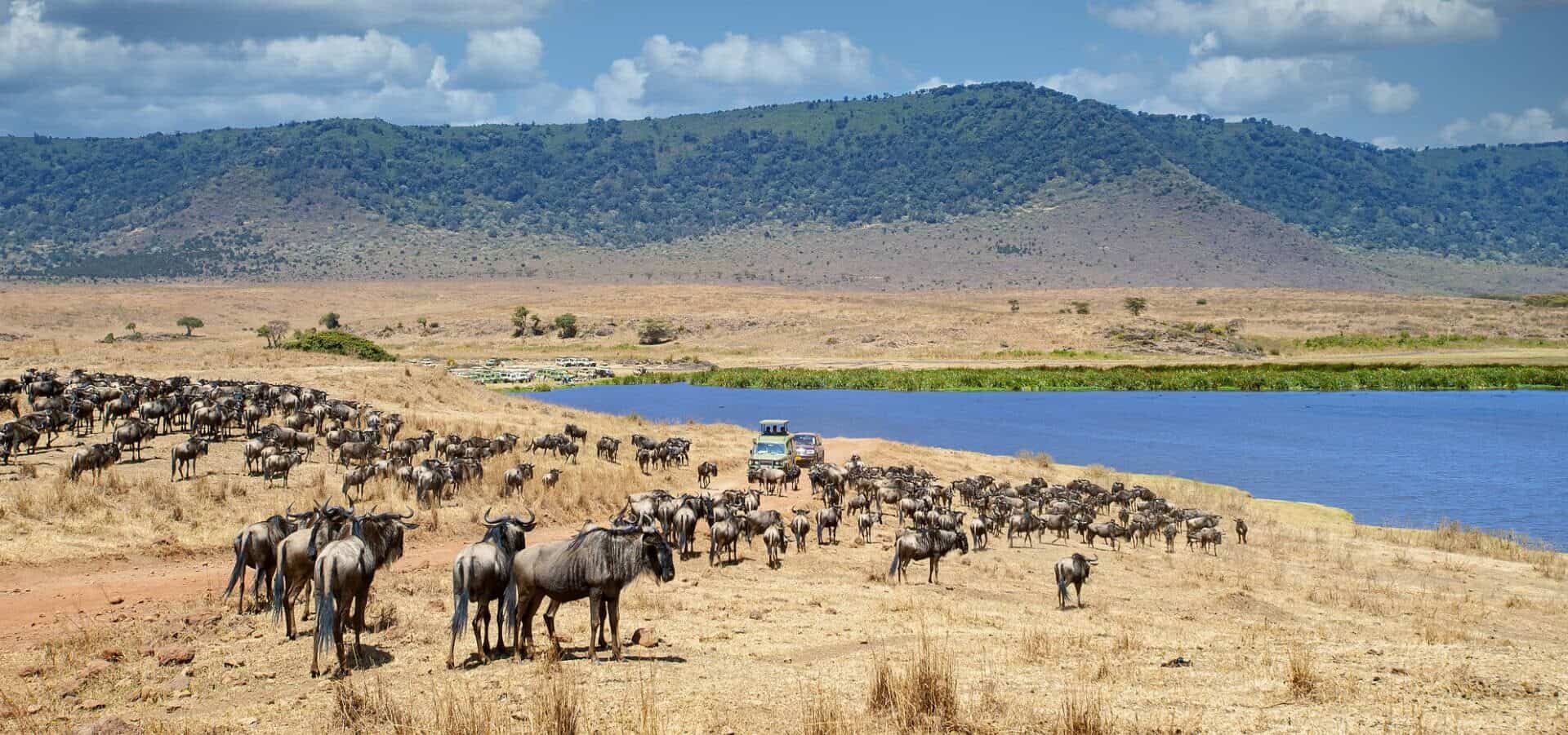 The first stop on our adventure was the Ngorongoro volcano. But the most memorable is the second leg of the expedition, the scene of the wildebeests crossing the Mara River. On the other side of the Mara River, a large group of wildebeests and zebras ran from three directions to gather on the river bank, and there were bursts of dust, forming a grand scene under the sun.