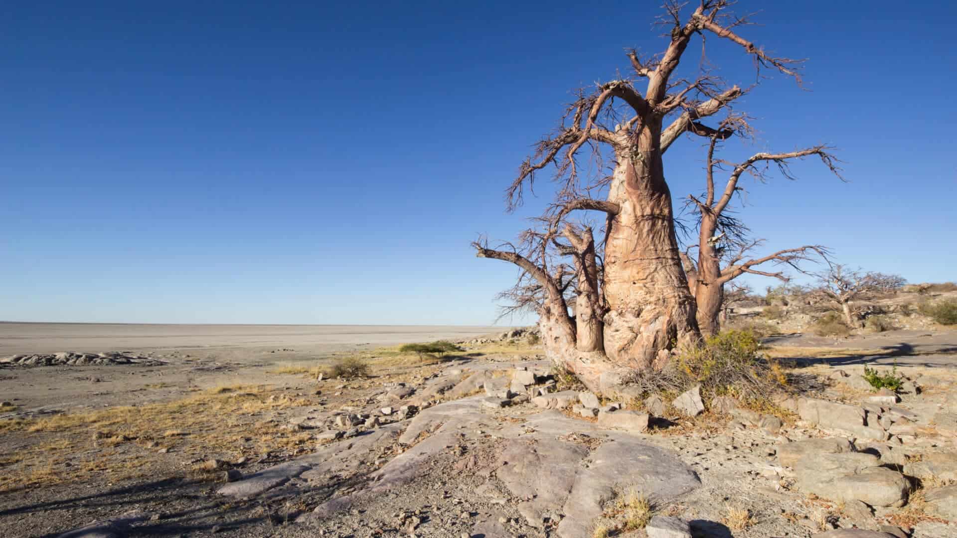 Kubu Island is 20 m/65 ft above the Makgadikgadi Pans and 1 km/0.6 mi wide. Guests visit the island to view the strange-looking baobab trees that resemble roots ascending to the sky. The African chestnut tree is also found on the island.