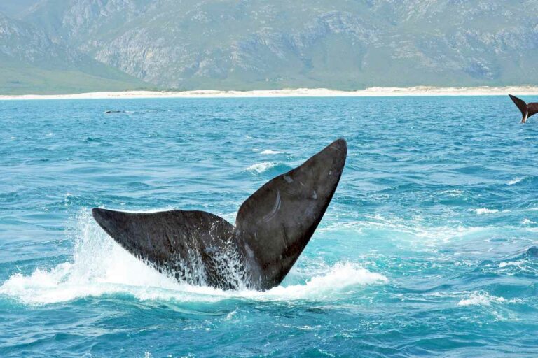 Between July and November every year, a multitude of southern right whales migrate to the shores of the small seaside town and the former fishing village of Hermanus. They are easy to see from the beach or from the scenic coastal cliff paths that stretch all along and beyond the town.