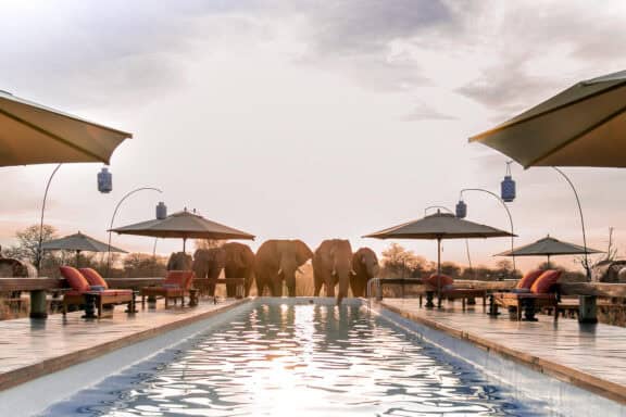 - Seven spacious en-suite tents and one two-bedroom family tent (sleeping five) on wooden decks, providing a vantage point over a permanent waterhole