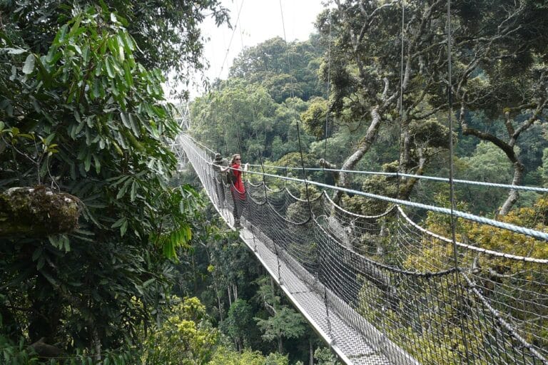 Gazetted in 2000, Nyungwe is Rwanda’s newest and largest national park, extending across 1,000 square kilometres of mountainous southwestern Burundi border region, where it protects the largest extant montane rainforest in East Africa. Nyungwe’s main attraction for most visitors is its population of at least 500 chimpanzees, which can be tracked at Cyamudongo, a relict montane forest patch protected as an isolated annex to the park. The other big draw, constructed in 2010, is a 200-metre-long canopy walkway that offers thrilling views of life above the forest floor.