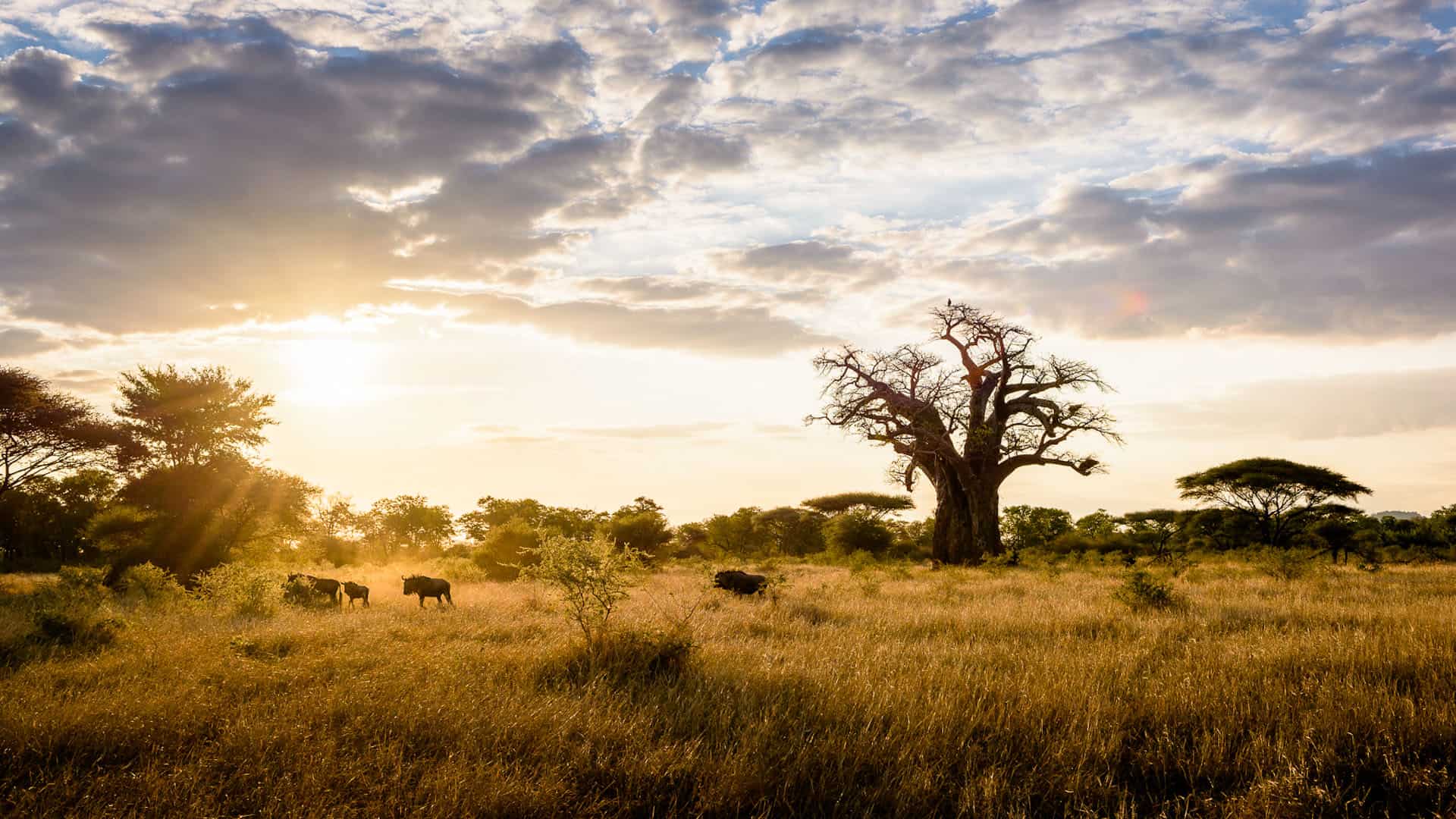 Herds of giraffes graze undisturbed, elephants wade slowly through sunlit rivers, and cheetahs or wild dogs may drift silently past, though these predators are seen less frequently than other species.