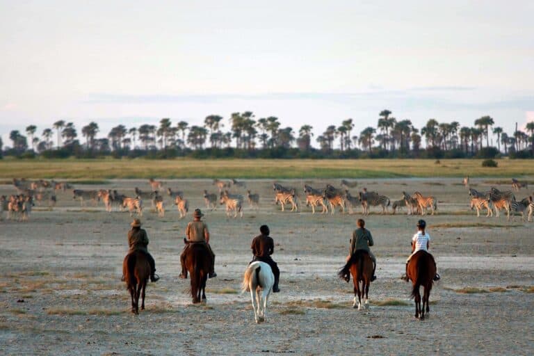 In between all your riding explorations, enjoy a walk with the San Bushmen and siestas around the swimming pool – a soothing escape from the desert sun. At the height of the zebra migration, the adjoining grasslands are awash with zebras, wildebeests, and more.