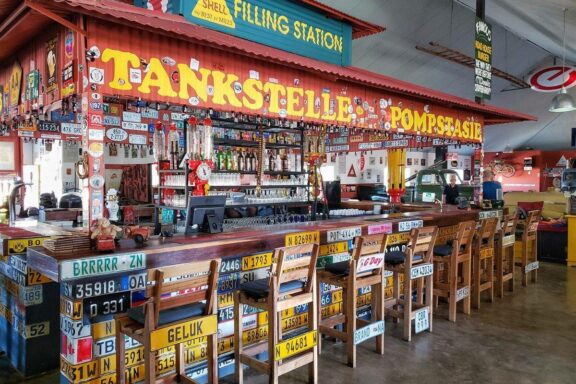 The road now leads through the Gondwana Canyon Park, a 130 000-hectare private nature reserve, past the old limestone kiln at Holoog, which is visible before the turn-off to the Fish River Canyon and Canyon Roadhouse. The red-roofed Roadhouse appears 16km further on with its wonderful collection of classic automobiles. You have reached your friendly and colourful home for the next two nights, to rest, explore, and fill up on smiles and its famous Amarula cheesecake.