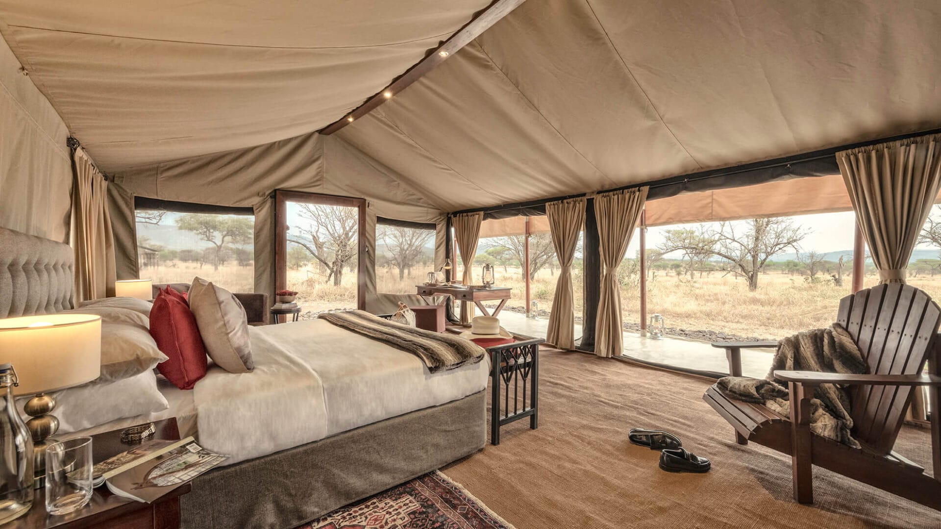 Located at eye level with grazing herds of wildlife, the camp has been beautifully designed to capture the best views over the Serengeti plains, offering you a peaceful and nurturing place of solitude and respite from modern life. Sundowners can be enjoyed under the lantern lit tree with a large open fire every evening. Enjoy endless views, fire-lit meals under the vast African sky and sleep soundly with the sound of the wild as a soothing background.